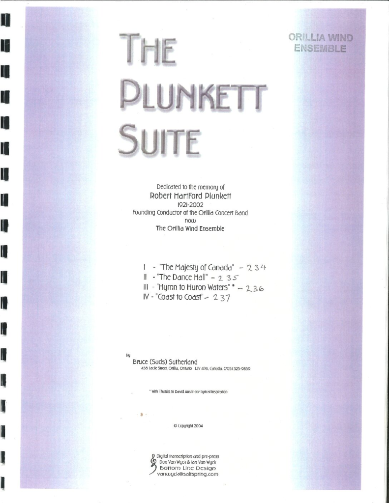 “Dedicated to the memory of Robert Hartford Plunkett 1921 to 2002. Founding Music Director of the Orillia Concert Band, composed by Bruce Sutherland” in four movements in 2004